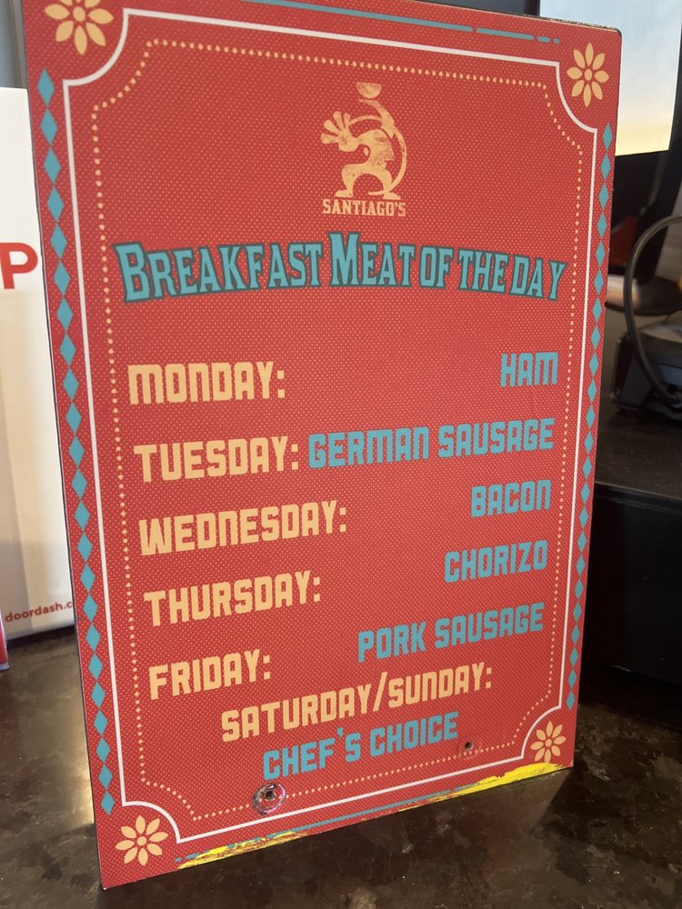 Santiago's signature item. Eggs, potatoes and chef's choice of meat: ham, bacon, chorizo or breakfast sausage.