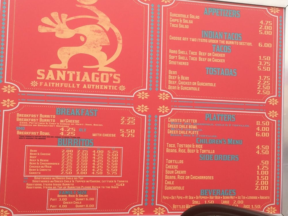 Santiago's signature item. A flour tortilla with a hamburger patty and beans, smothered with green chile and topped with cheese, lettuce and tomato.